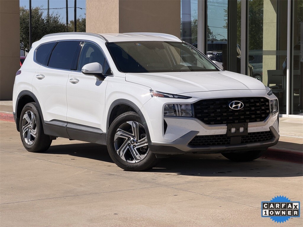 Certified. Serenity White Pearl 2023 Hyundai Santa Fe SEL FWD 8-Speed Automatic with SHIFTRONIC 2.5L I4 Black w/Stain-Resistant Cloth Seat Trim, 6 Speakers, All Season Fitted Liners, AM/FM radio: SiriusXM, Mudguards, Navigation System, Option Group 01, Winter Weather Package. Clean CARFAX.