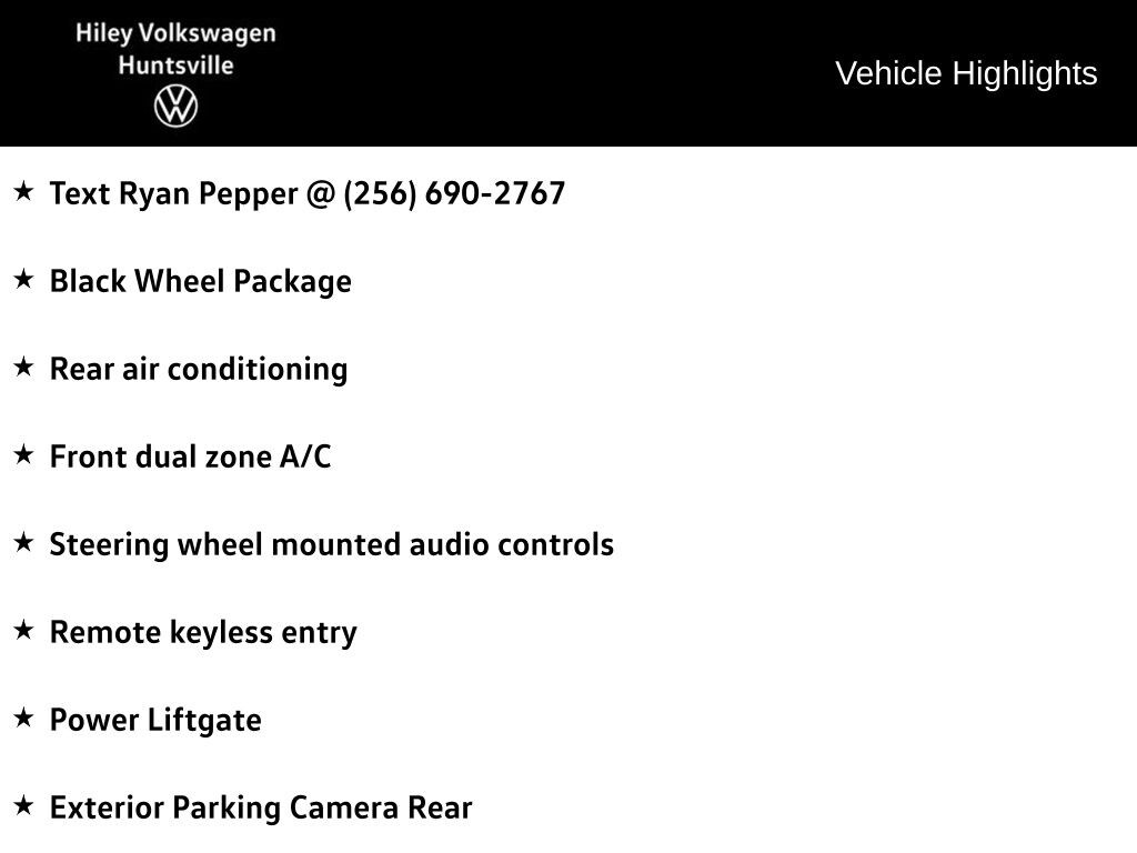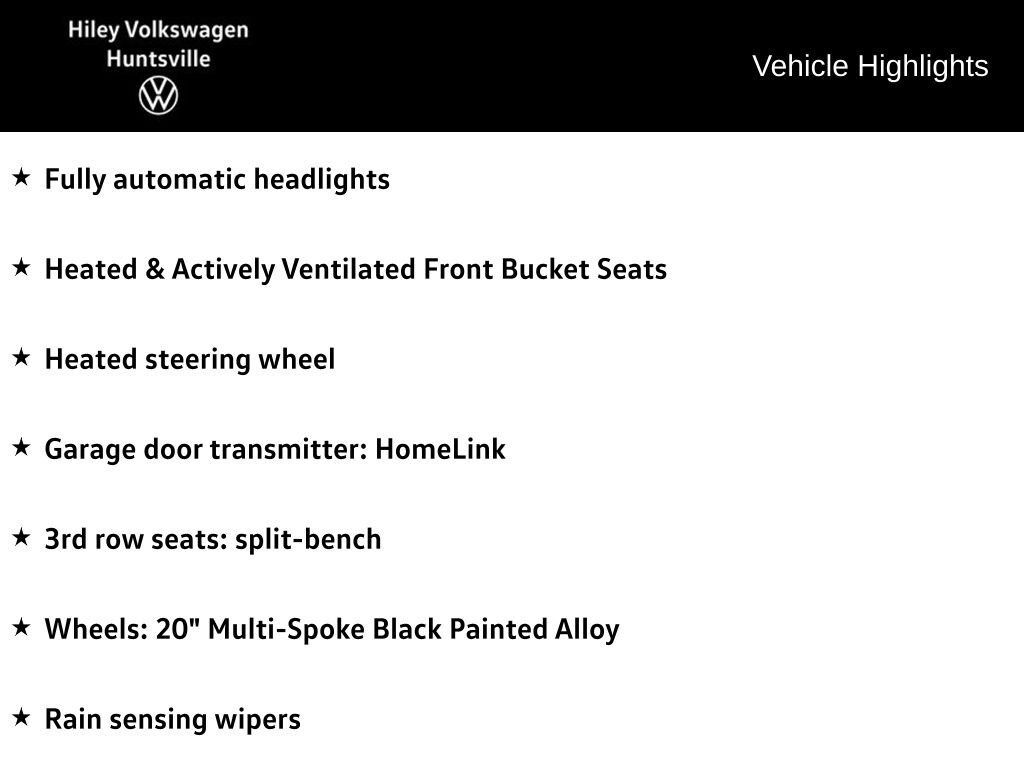 - Front dual zone A/C, Rear air conditioning, Remote keyless entry, Steering wheel mounted audio controls, Power Liftgate, Fully automatic headlights, Garage door transmitter: HomeLink, Heated & Actively Ventilated Front Bucket Seats, Heated steering wheel, Exterior Parking Camera Rear, 3rd row seats: split-bench, Wheels: 20" Multi-Spoke Black Painted Alloy, Rain sensing wipers