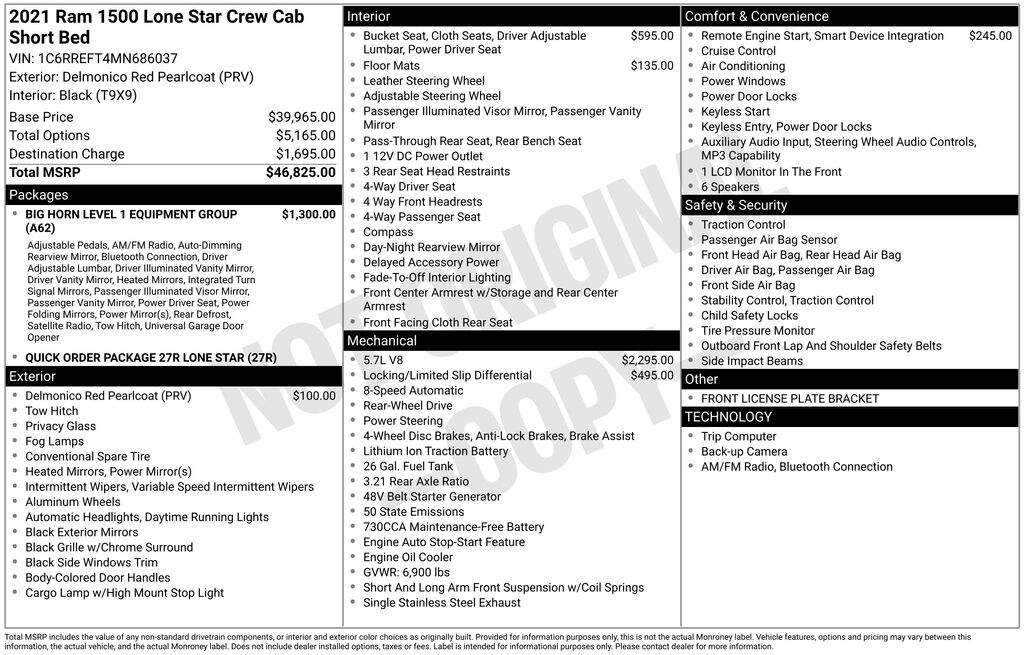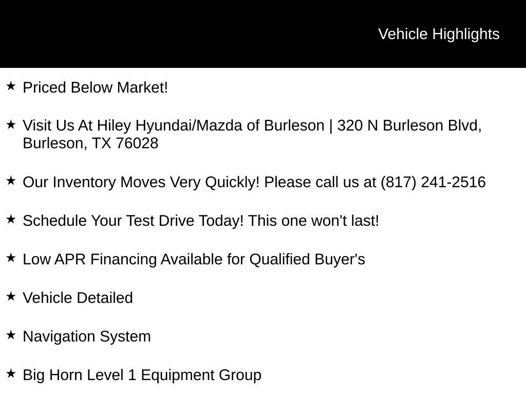 Backed by a detailed vehicle inspection, this 2021 Ram 1500 Big Horn/Lone Star is ready to take on the road with confidence. Don't miss your chance to experience the power and capability of this exceptional truck. Schedule your test drive today and discover why the Ram 1500 is the perfect choice for your next vehicle.